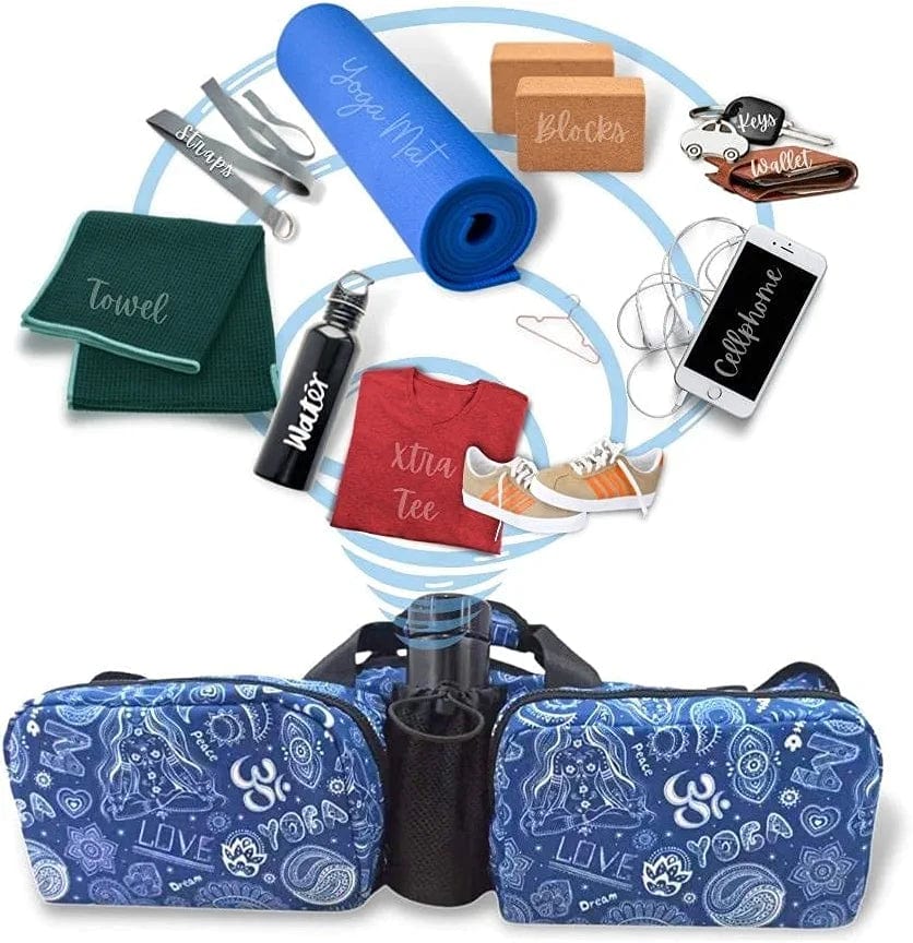 - COMPARTMENTALIZE: 6 Zones to utilize. 2 front pockets (10x7x4”) that stores Yoga Blocks or Shoes or other essentials. Mesh pocket to keep a water bottle. Large center zippered pocket to keep a towel + extra clothing. Center zone to keep a rolled yoga mat. Back pocket to hold your keys + cellphone + wallet.